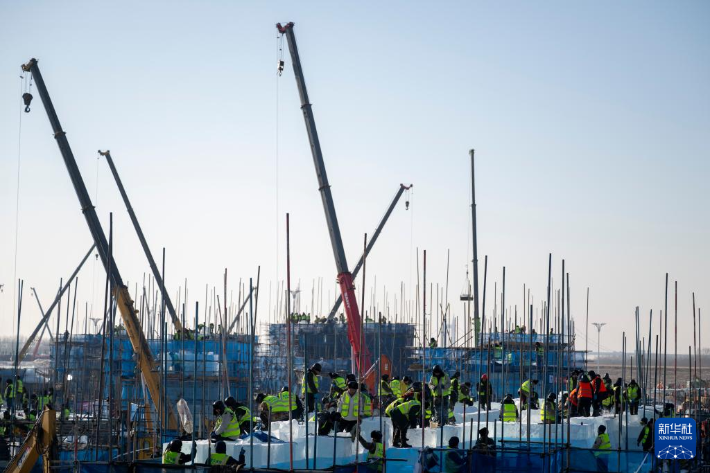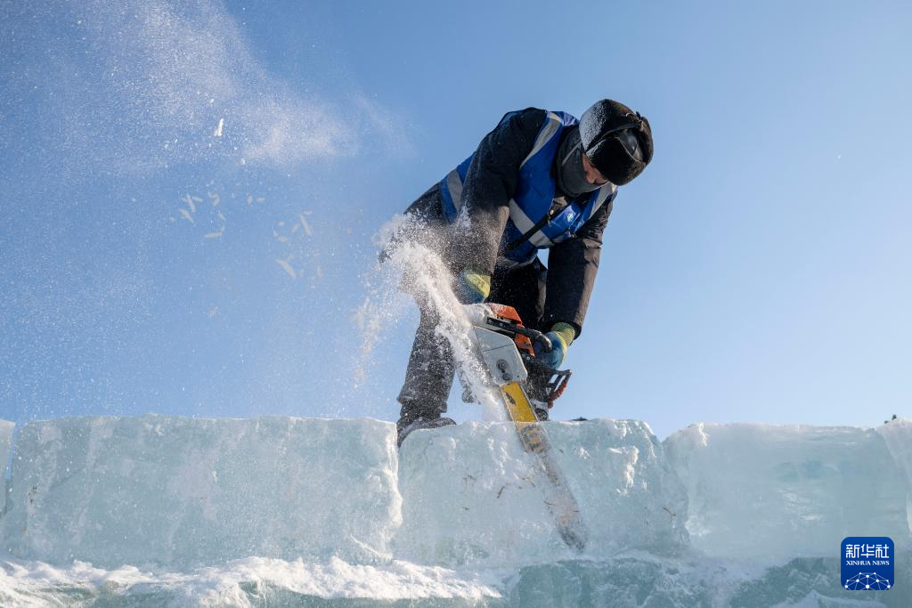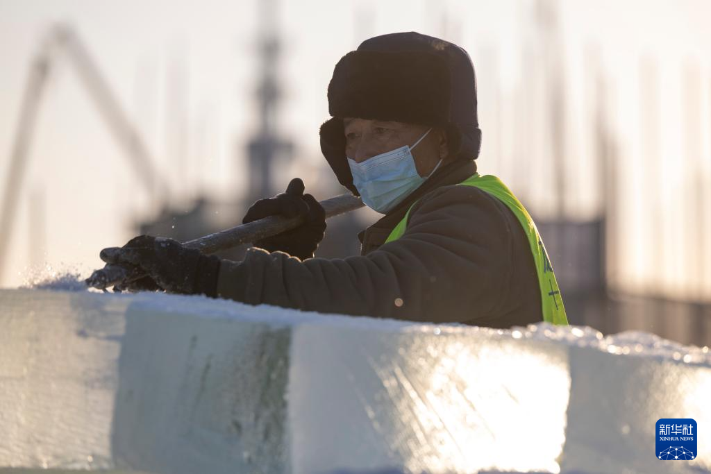 12月5日,在哈尔滨冰雪大世界施工现场,工人在进行冰建作业。新华社记者 张涛 摄
