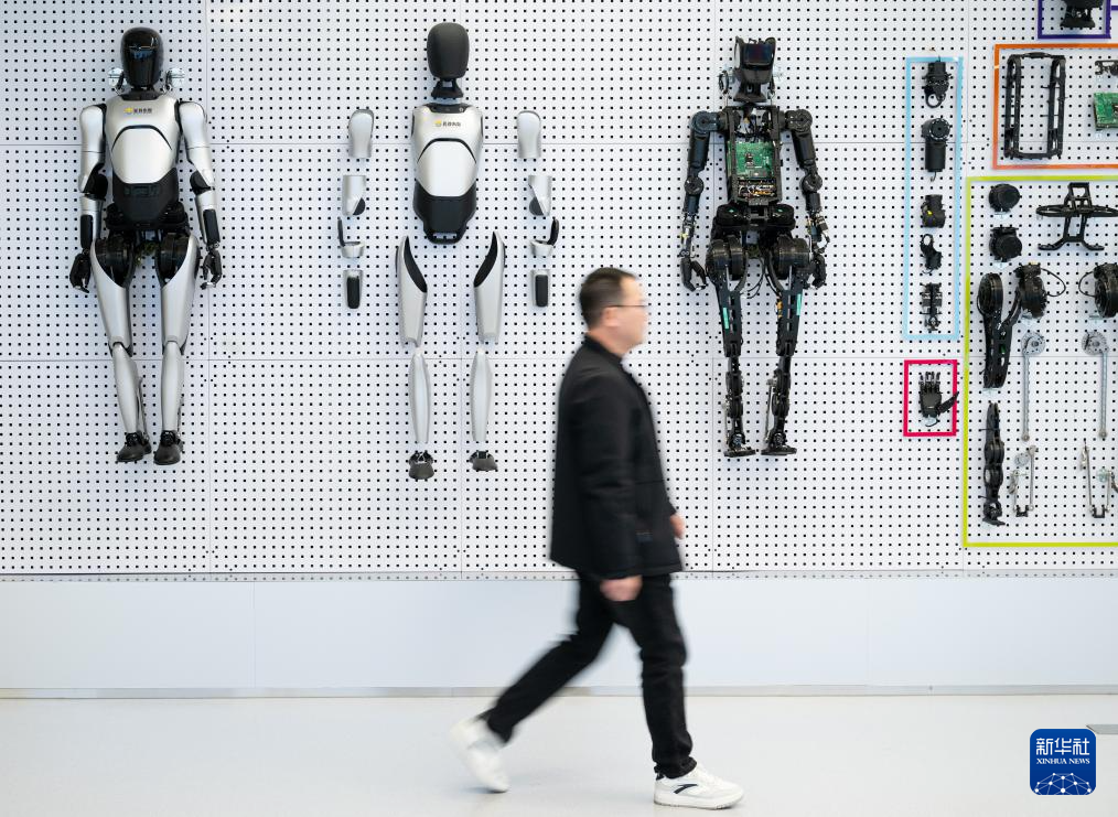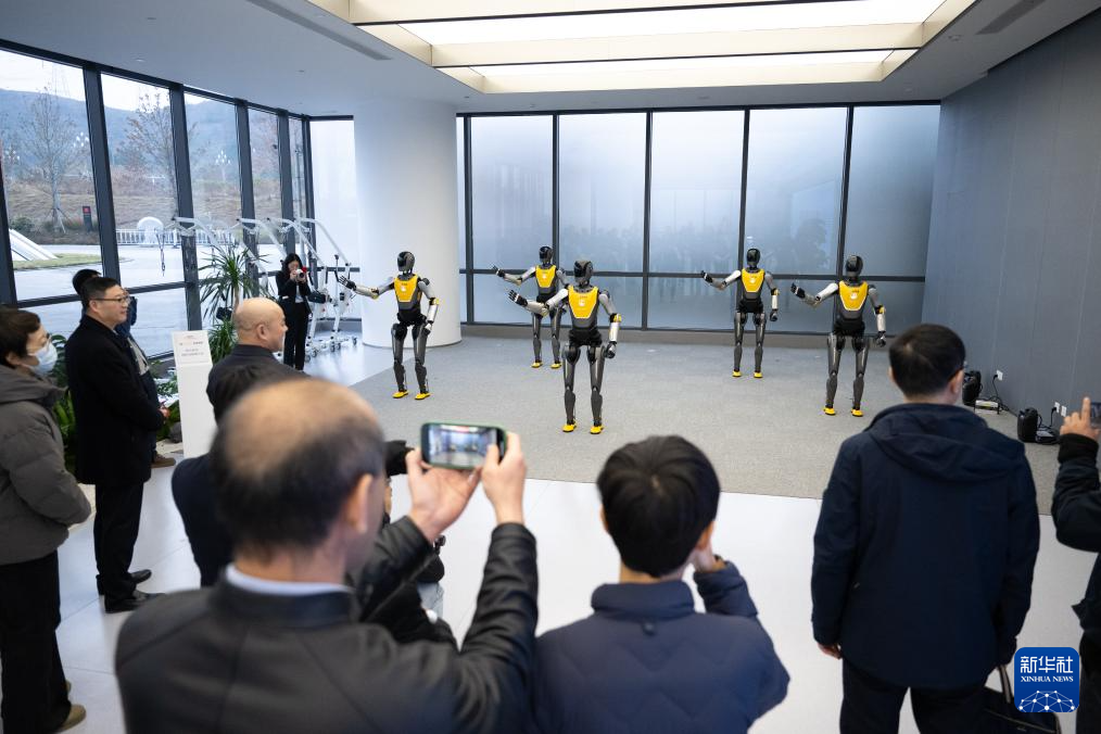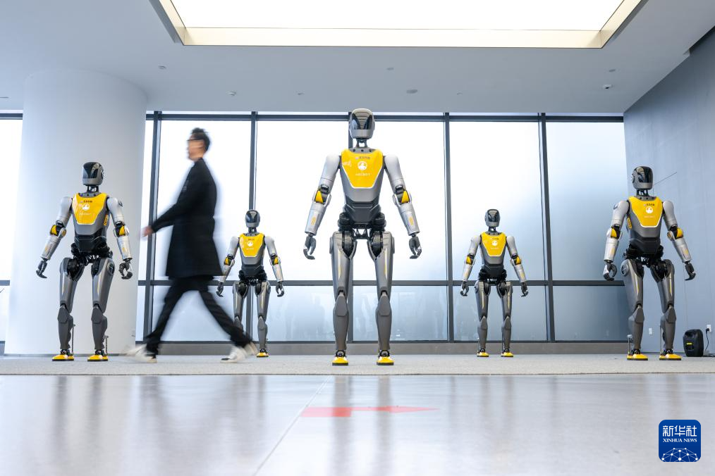 12月4日,在湖北人形机器人创新中心展示厅,参观者从机器人群中走过。新华社记者 肖艺九 摄