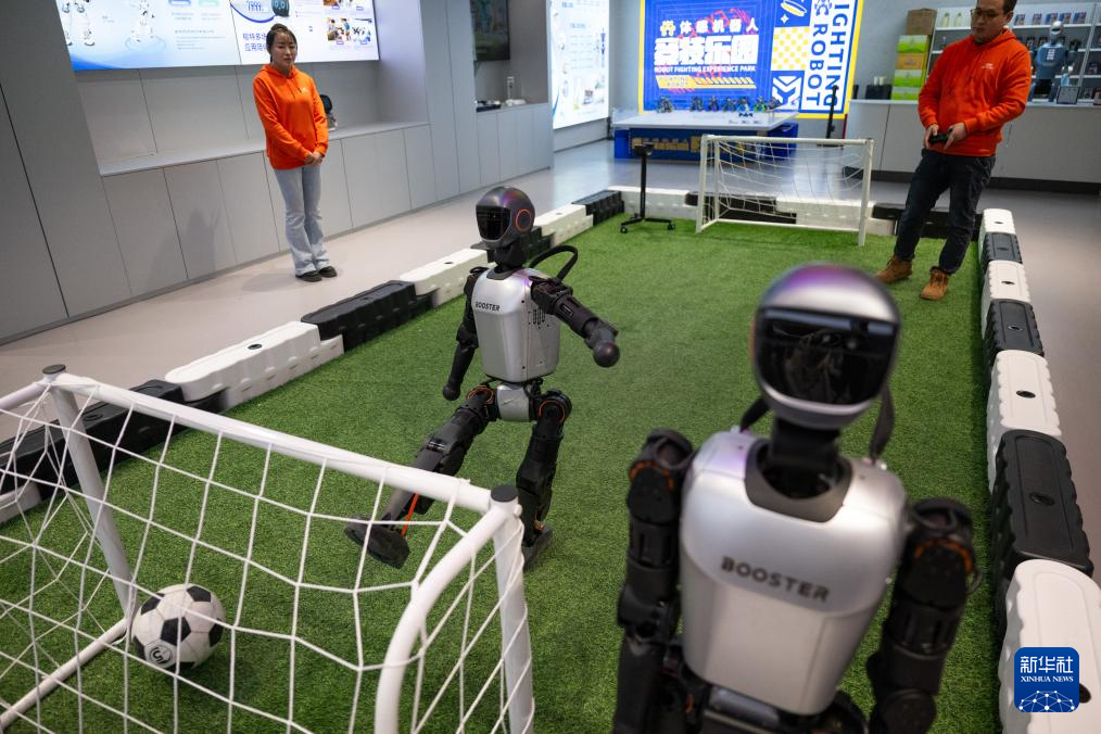 12月4日,在湖北光谷人形机器人7S店,人形机器人进行足球射门表演。新华社记者 肖艺九 摄