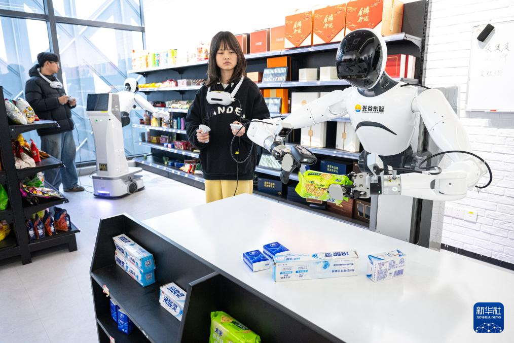 12月4日,在湖北人形机器人创新中心,数据采集员操作人形机器人进行超市场景的数据采集。新华社记者 肖艺九 摄
