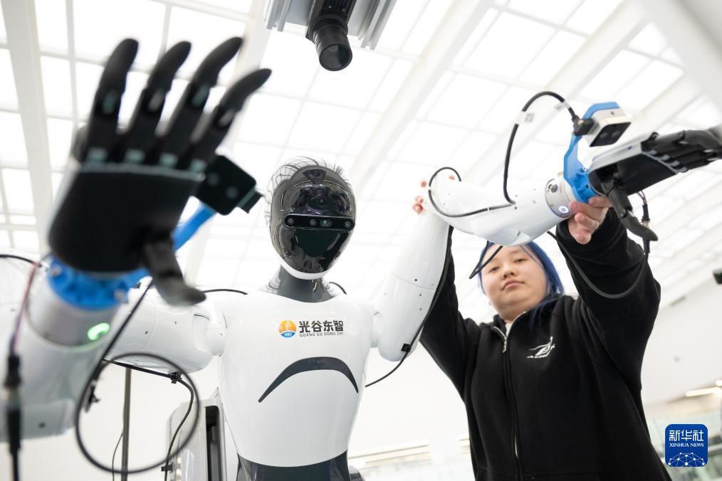 12月4日,在湖北人形机器人创新中心,数据采集员操作人形机器人进行数据采集。新华社记者 肖艺九 摄