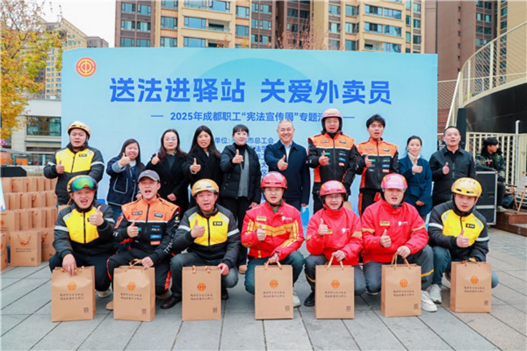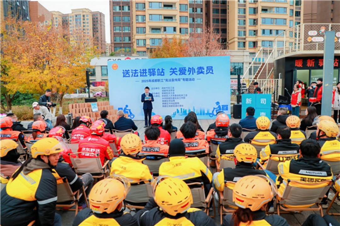 12月4日是第十二个国家宪法日。日前,为迎接国家宪法日,2025年成都市职工“宪法宣传周”外卖配送员专场——“送法进驿站、关爱外卖员”主题宣传活动在新都区七一广场工会驿站・暖心驿站举行。