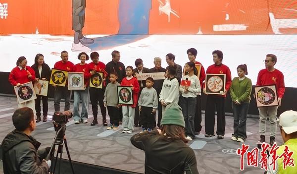 山西临汾红丝带学校学生代表将亲手绘制的画作赠予电影《青爱》的主创人员。中青报·中青网记者 李怡蒙/摄