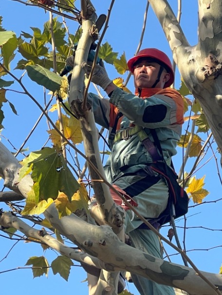 他紧握电锯,眼神专注地盯着眼前的树枝。随着电锯发出低沉而有力的嗡鸣声,枯枝、病枝纷纷落地。原本有些杂乱的树冠,在精心修剪下,逐渐显露出清爽的轮廓,仿佛一位蓬头垢面的老人经过精心打理后焕发出新的生机。