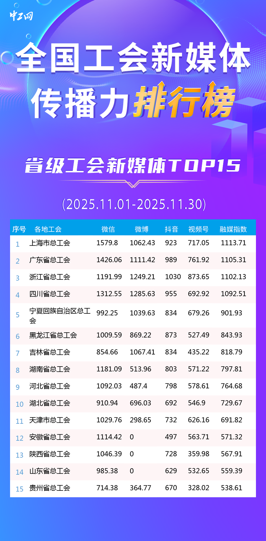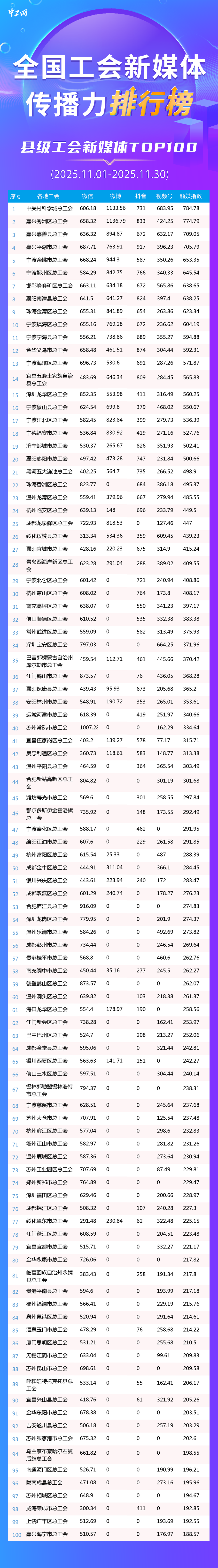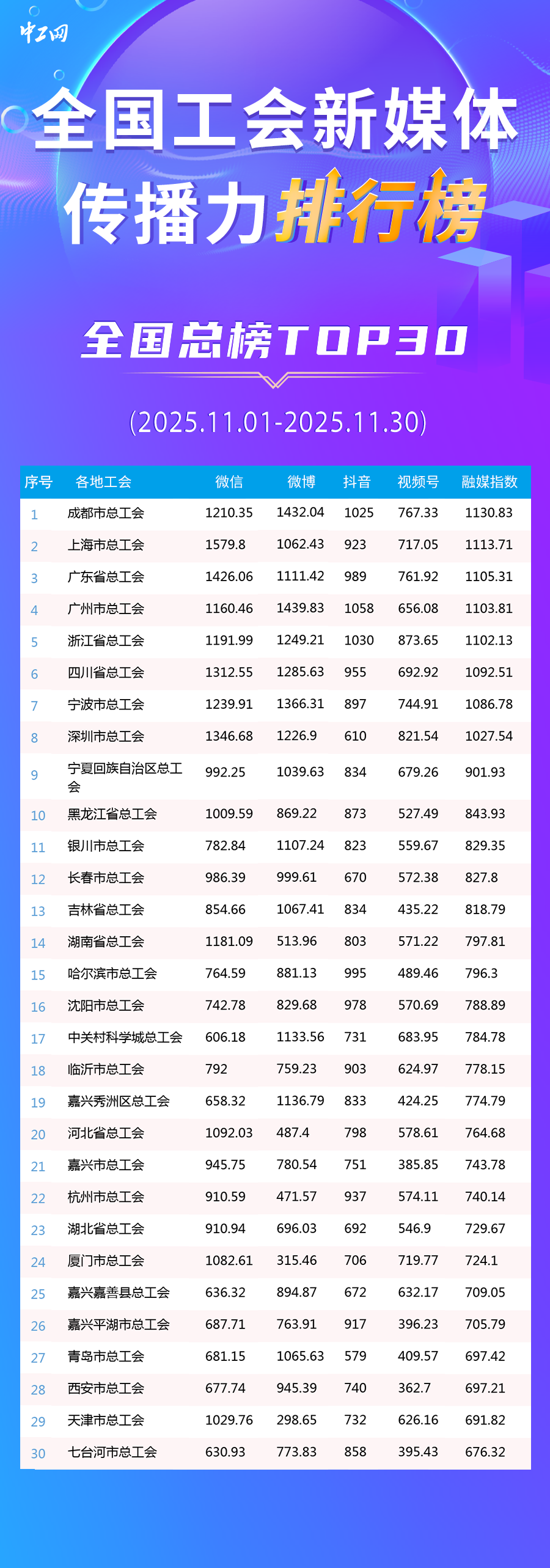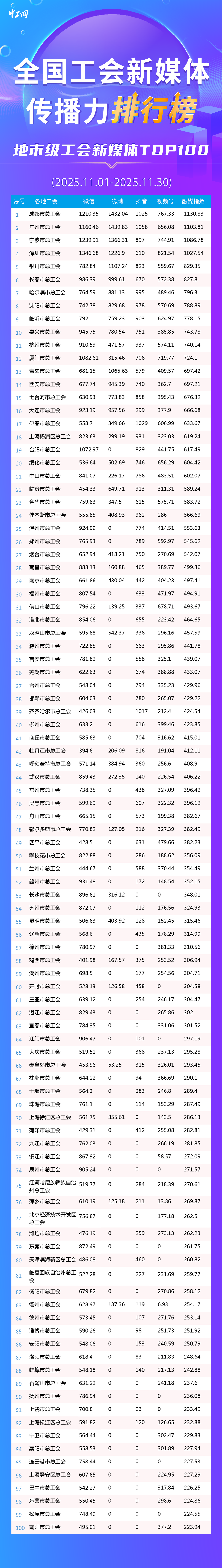 11月全国工会新媒体传播力排行榜全国总榜TOP30