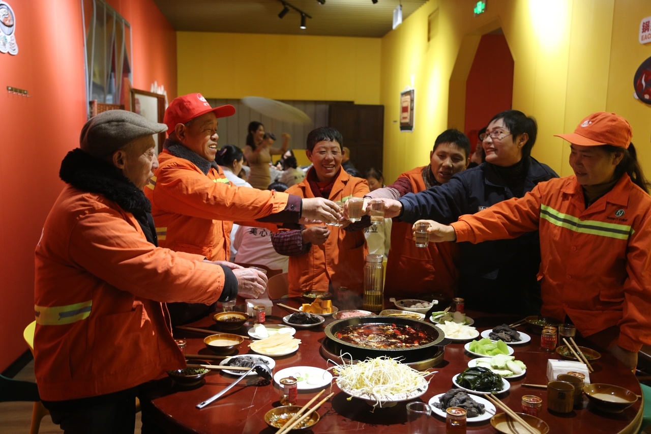 中午时分,火锅店里香气四溢,暖意融融。环卫工人们围坐在一起,桌上摆满了新鲜的食材,红汤热辣滚烫,欢声笑语在店内回荡。大家一边品尝着美味的火锅,一边欣赏着舞蹈表演,脸上洋溢着欢乐的笑容。