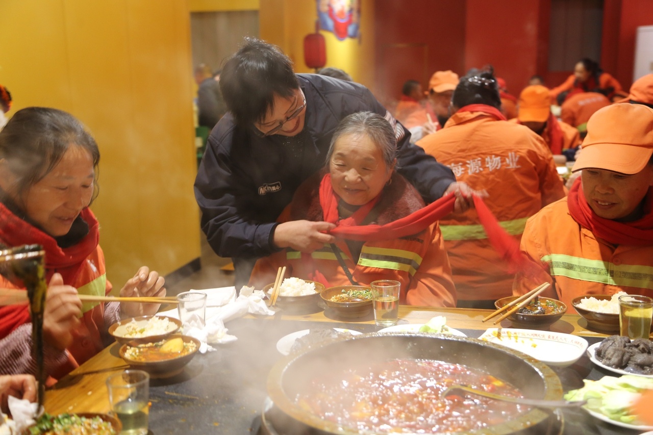 谈及此次活动的初衷,美心红酒小镇景区火锅店负责人吴含一边给大家系上红围巾一边感慨:“一线环卫工人无论严寒酷暑,都坚守在大街小巷,用辛勤的汗水换来我们这里的干净整洁。我们怀着感恩的心回馈他们,也希望通过这份小小的心意,让他们感受到社会的尊重和关爱,也希望让更多的人共同爱护我们的生活环境。”