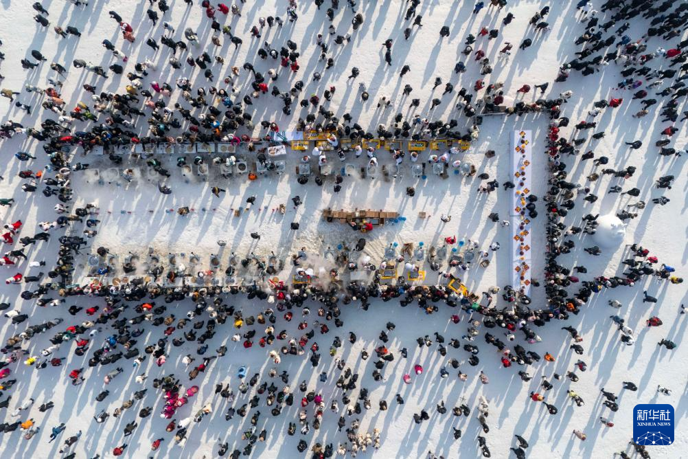 12月7日,市民和游客在第六届哈尔滨采冰节现场品尝美食(无人机照片)。新华社记者 张涛 摄