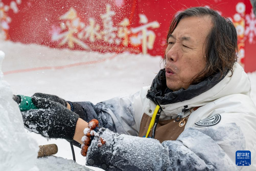 12月7日,冰雕师在第六届哈尔滨采冰节现场制作冰雕。新华社记者 张涛 摄