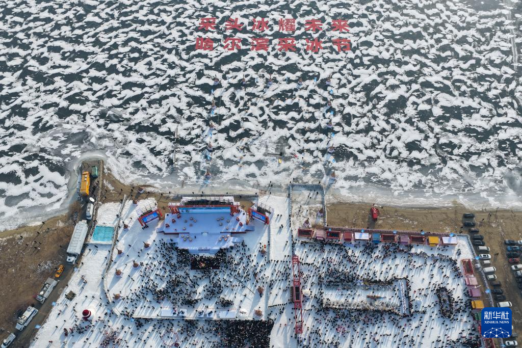 12月7日,人们在第六届哈尔滨采冰节现场与从松花江采出的“头冰”合影(无人机照片)。新华社记者 王松 摄