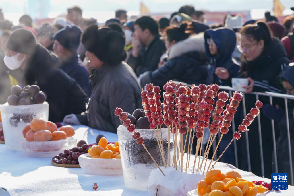 这是12月7日拍摄的第六届哈尔滨采冰节冰雪大市集上的冰糖葫芦等美食。新华社记者 王松 摄