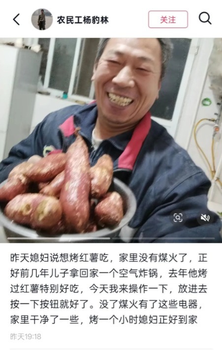 配图中,一位两鬓发白的中年男性,穿着有些泥灰的黑色外套,一只手端着的盆里盛满了洗净的红薯,一只手举着手机自拍,脸上是咧着嘴的笑容。
