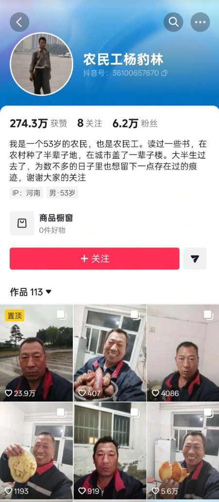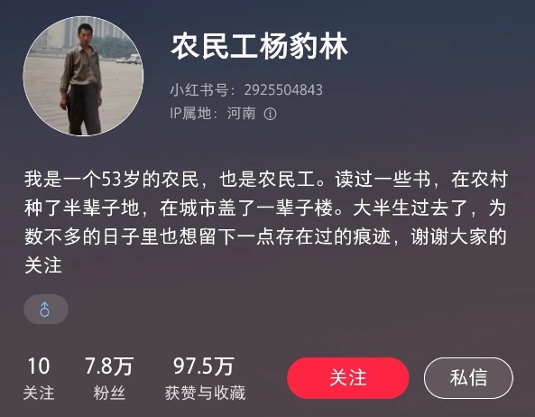 简介中写道:我是一个53岁的农民,也是农民工。读过一些书,在农村种了半辈子地,在城市盖了一辈子楼。大半生过去了,为数不多的日子里也想留下一点存在过的痕迹,谢谢大家的关注。