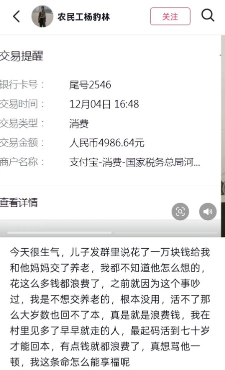 『今天很生气,儿子发群里说花了一万块钱给我和他妈妈交了养老,我都不知道他怎么想的花这么多钱都浪费了……真想骂他一顿,我这条命怎么能享福呢』