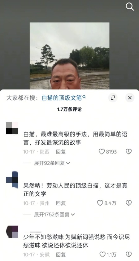 一百多条动态中,有的点赞量突破3万、6万、8万、23.9万。评论区中,有网友称赞“劳动人民的顶级白描”“最难最高级的手法,用最简单的语言,抒发最深沉的故事”“当知足凌驾于欲望之上,幸福就会贯穿一生”。
