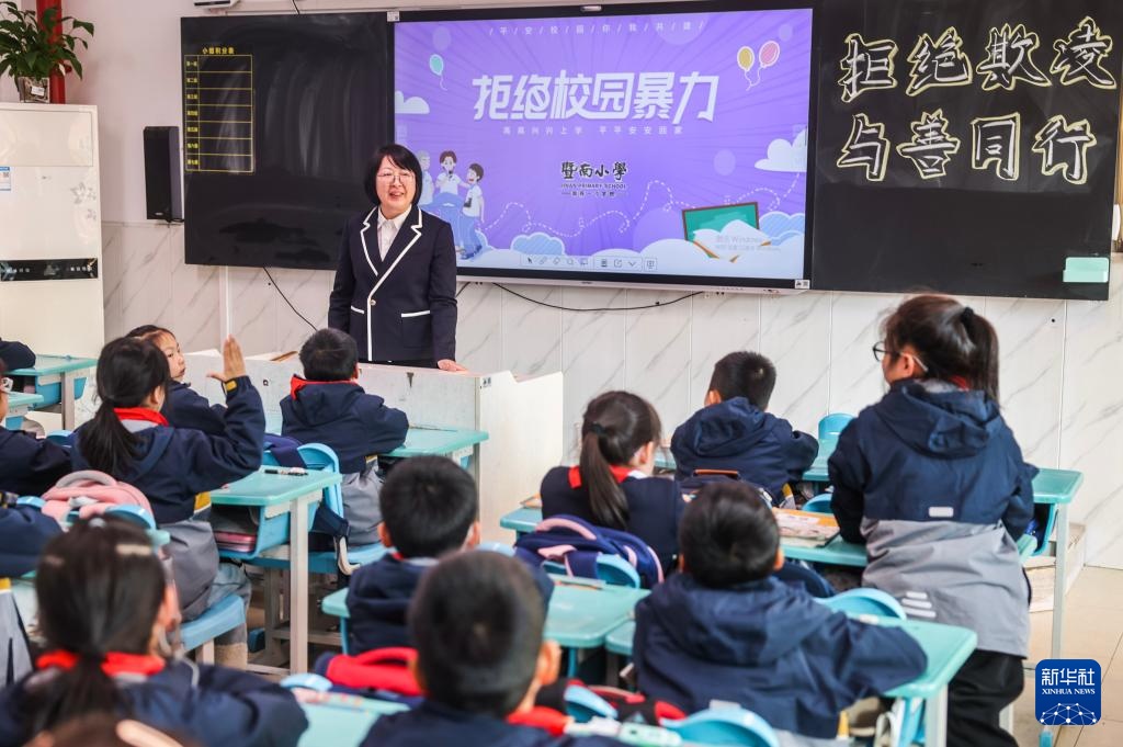 12月9日,诸暨市暨南司法所的司法工作者在暨南街道中心学校暨南小学的课堂上给学生们进行“拒绝校园暴力”的主题讲座,通过案例分析、互动问答等形式,详细讲解校园防欺凌的表现、危害及应对方法。新华社记者 徐昱 摄