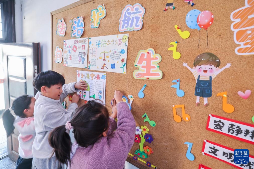 12月9日,诸暨市暨南街道中心学校王家井小学的学生把自己创作的法治宣传画贴到教室的宣传栏中。新华社记者 徐昱 摄