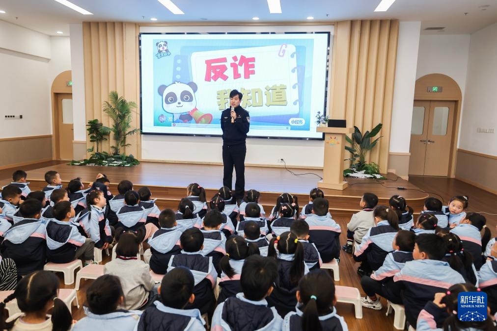 12月9日,诸暨市暨南街道派出所民警来到暨南街道中心学校三江幼儿园,给师生们举办防诈反诈知识讲座。新华社记者 徐昱 摄