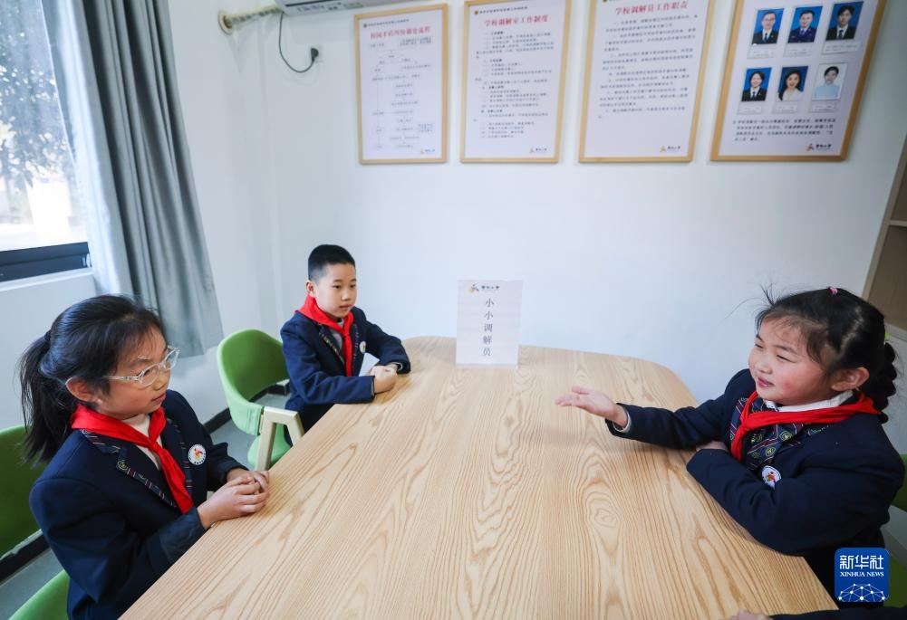 12月9日,在暨南街道中心学校暨南小学的矛盾调解室,学生调解员(右一)在调解同学间的小矛盾、小纠纷,这也是学校培养学生法治意识和调解能力的方式之一。新华社记者 徐昱 摄