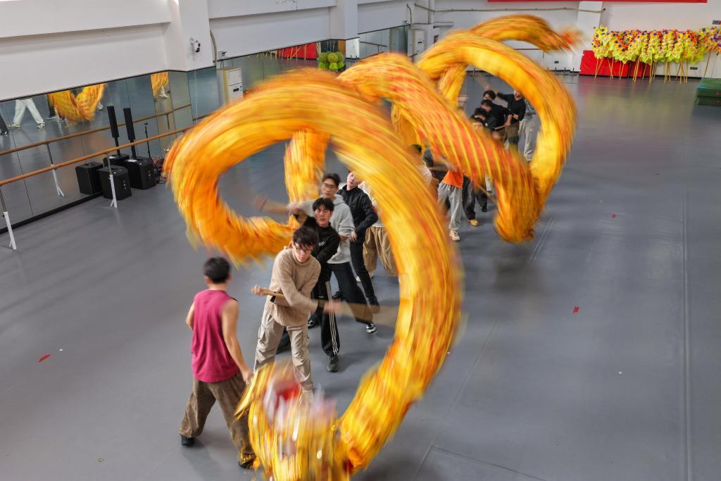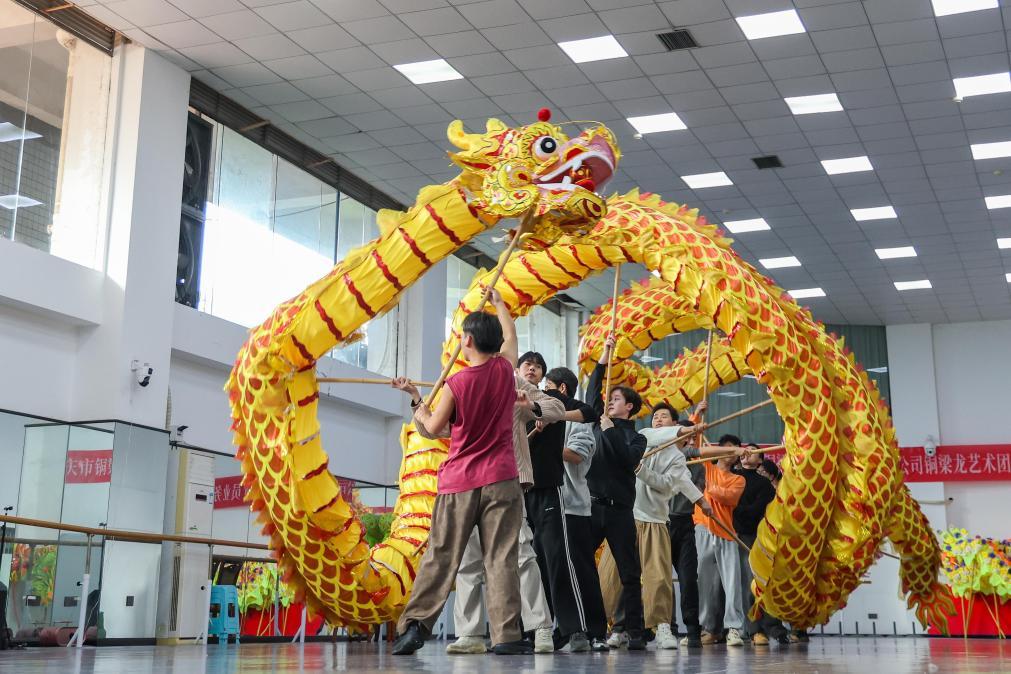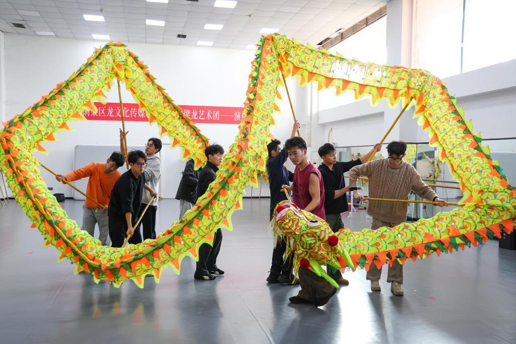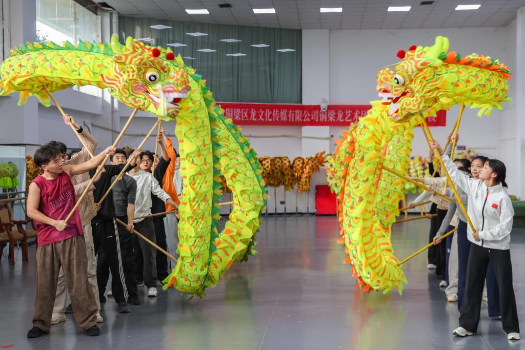 12月7日,重庆铜梁龙艺术团竞技舞龙队队员在进行日常训练。