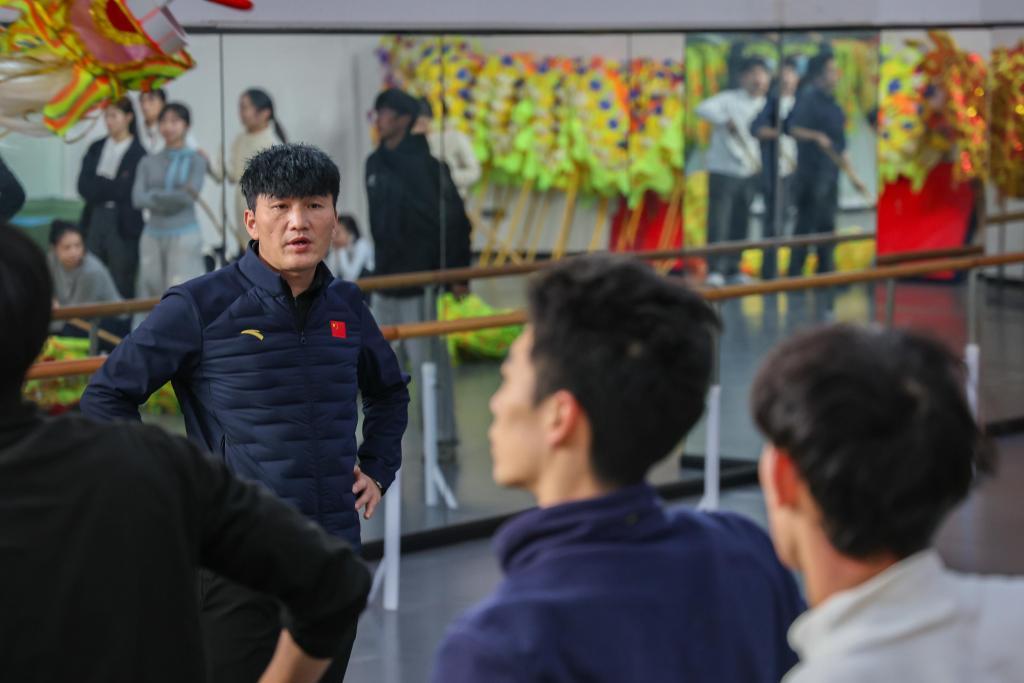 12月7日,重庆铜梁龙艺术团团长蔡明灿(左二)在指导竞技舞龙队队员进行动作训练。