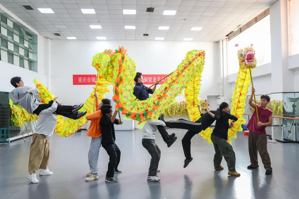 12月7日,重庆铜梁龙艺术团竞技舞龙队队员魏烨(左二)和队友进行日常训练。