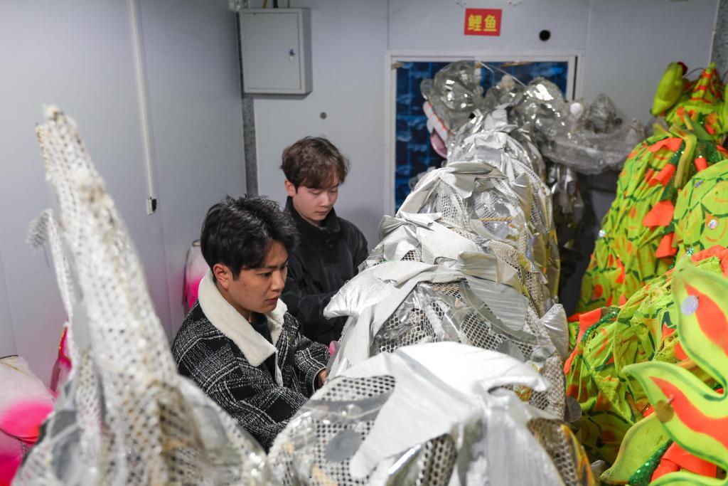 12月6日,在铜梁区玄天湖龙舞广场,重庆铜梁龙艺术团竞技舞龙队队员魏烨(左)、秦新松在演出前检查表演道具。