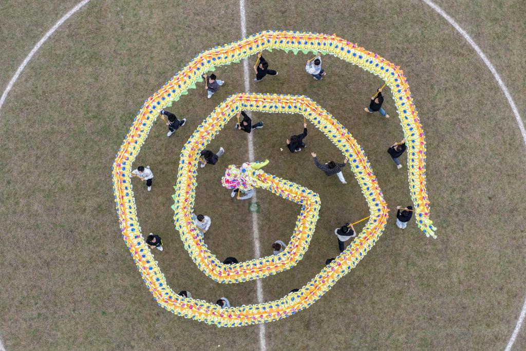 12月6日,重庆铜梁龙艺术团竞技舞龙队队员在“渝超”赛场排练(无人机照片)。