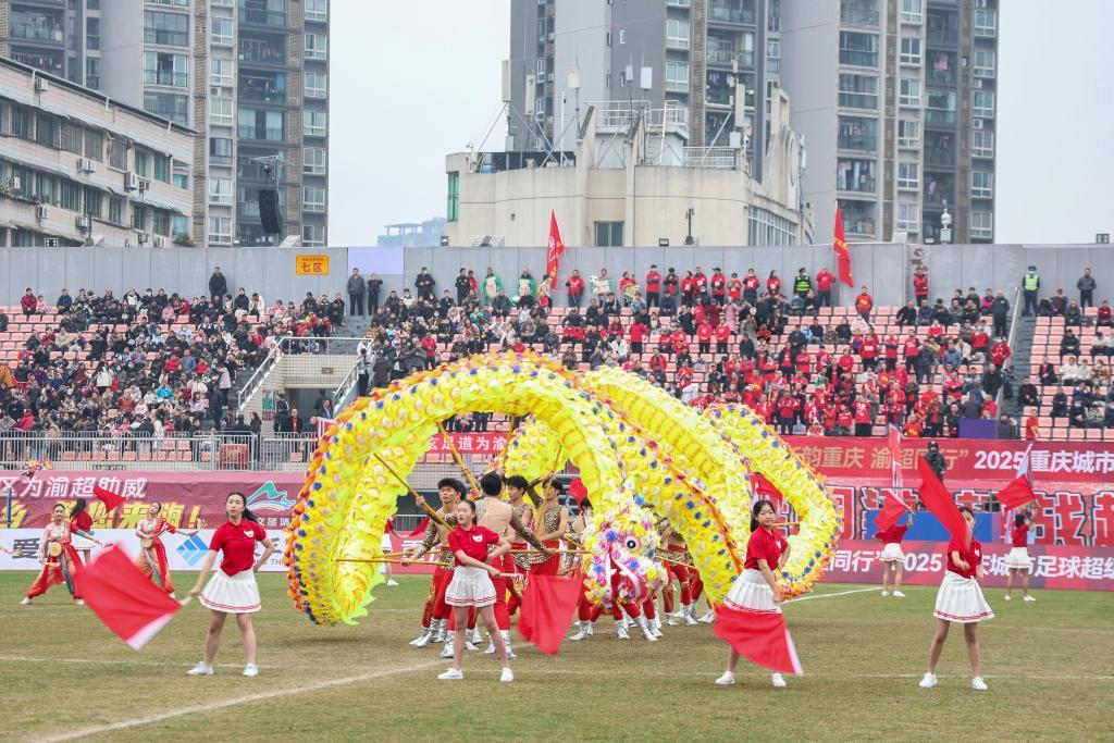 12月6日,重庆铜梁龙艺术团竞技舞龙队队员在“渝超”赛场进行暖场表演。