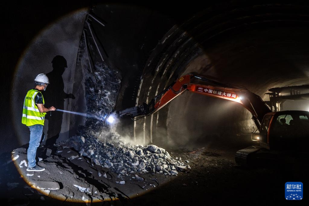 中国铁建大桥局的建设者在渝昆高铁彝良隧道内作业(12月9日摄)。新华社记者 胡超 摄