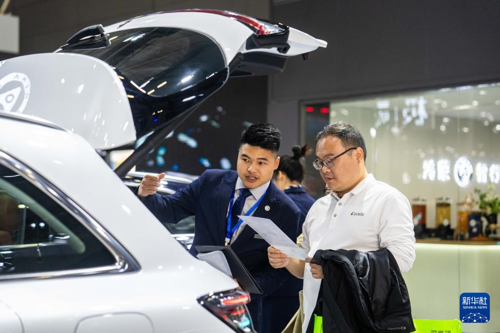 12月10日,在长沙国际会展中心,工作人员(左)在介绍参展车辆。新华社记者 陈思汗 摄