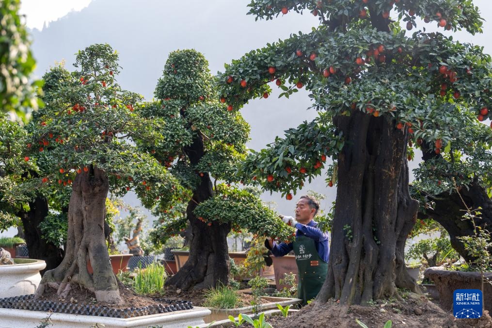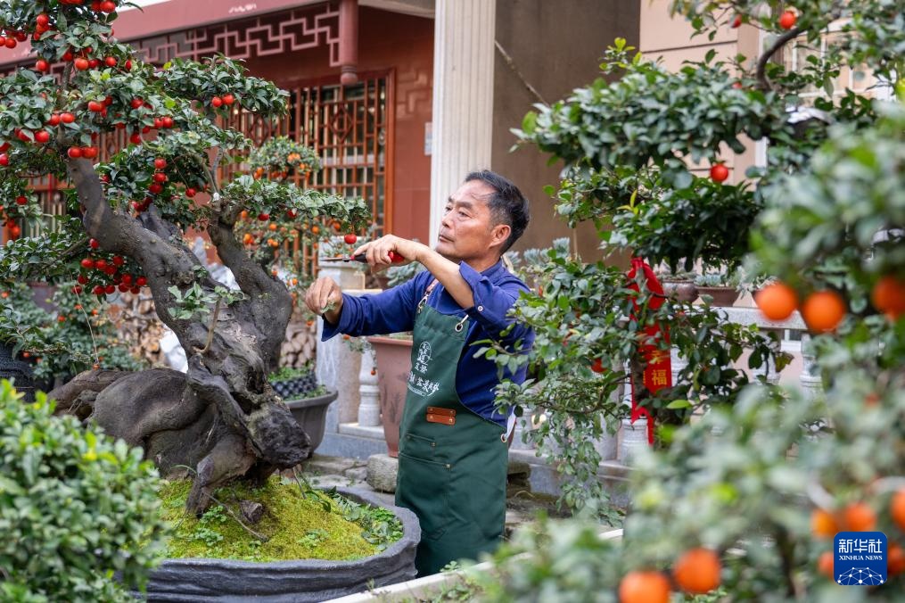12月10日,在湖北省宜昌市长阳土家族自治县高家堰镇高家堰村,村民涂常兵在修剪院中盆景。新华社记者 杜子璇 摄