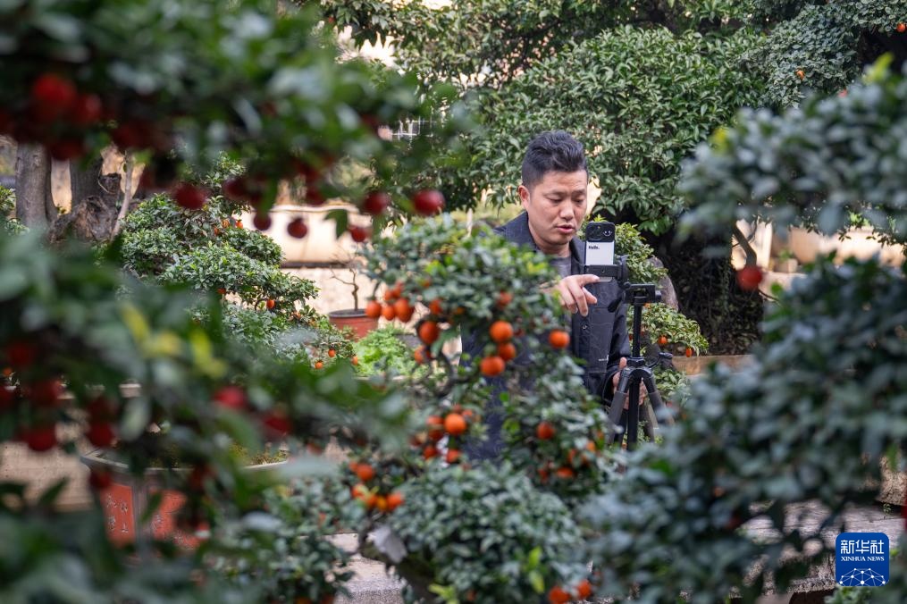 12月10日,在湖北省宜昌市长阳土家族自治县高家堰镇高家堰村,村民郑伟在直播销售院中盆景。新华社记者 杜子璇 摄
