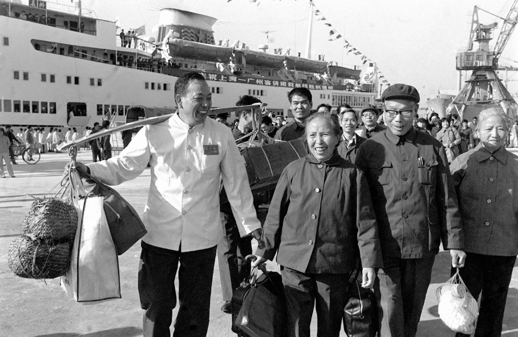 上世纪80年代,杨怀远(前左)帮助旅客挑运行李(资料照片)。新华社记者徐义根 摄
