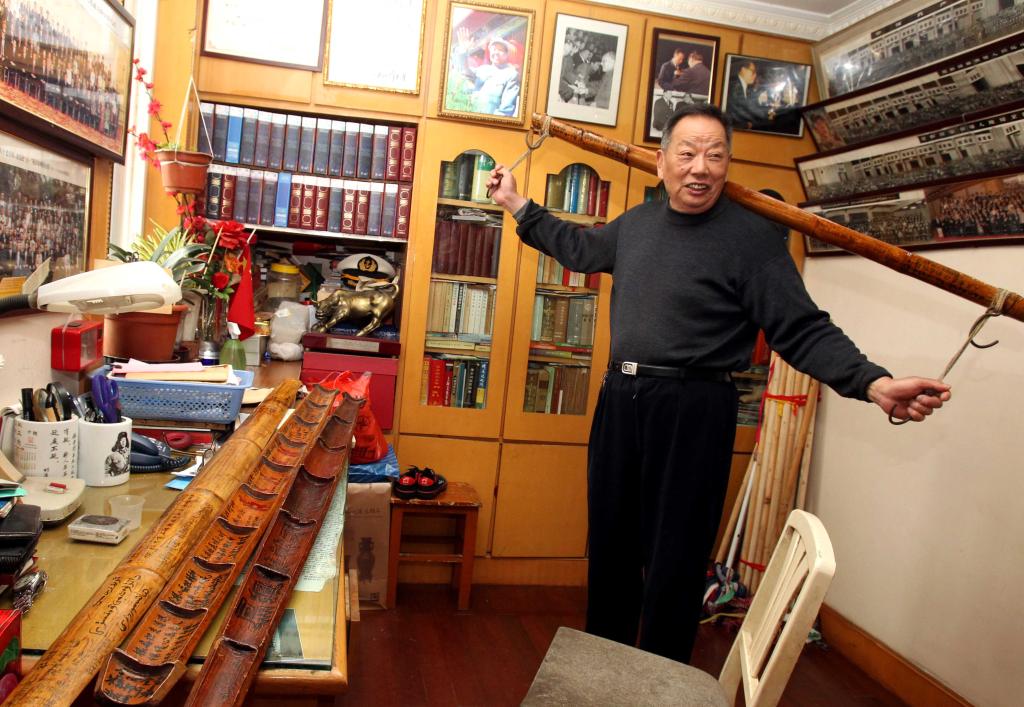 2012年,杨怀远在家里展示自己的小扁担(资料照片)。新华社记者刘颖 摄