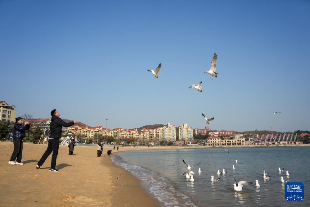 12月9日,人们在威海市海滨游览。新华社记者 徐速绘 摄