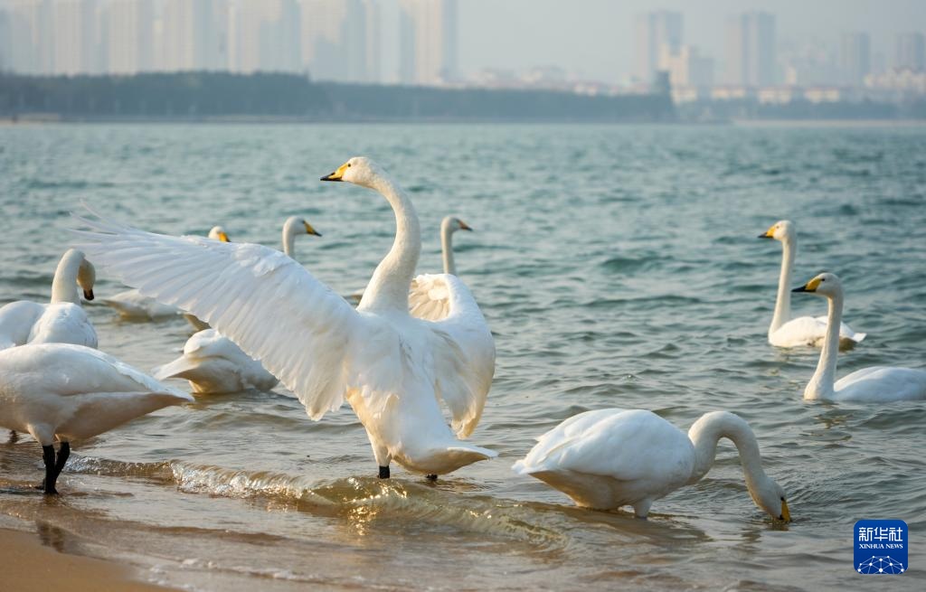 这是12月9日在威海九龙湾拍摄的野生天鹅。新华社记者 徐速绘 摄