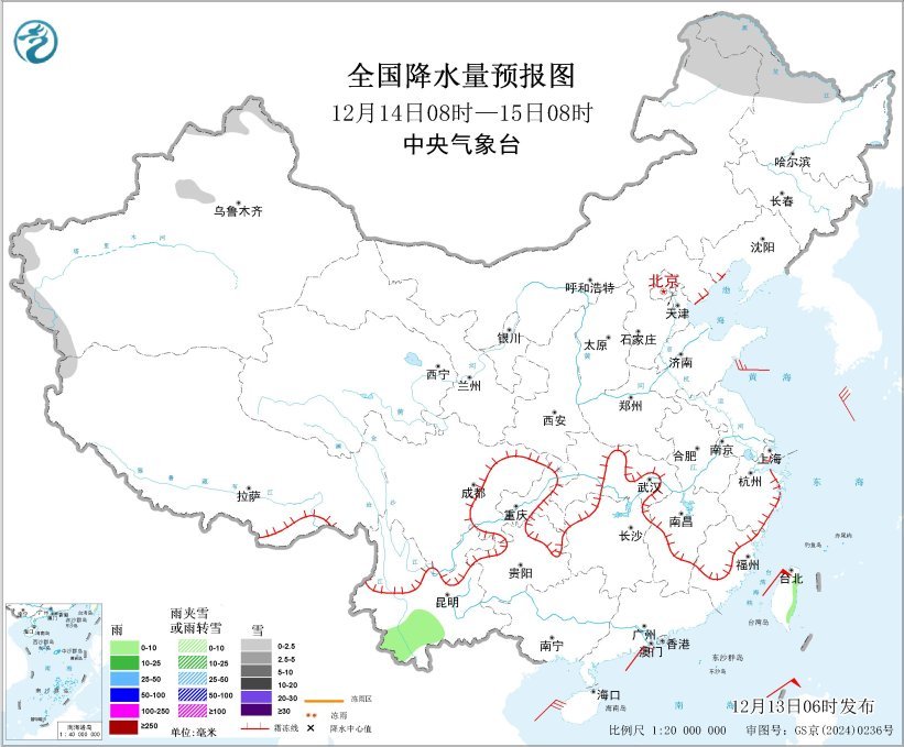 全国降水量预报图(12月13日08时-14日08时) 来源:中央气象台网站