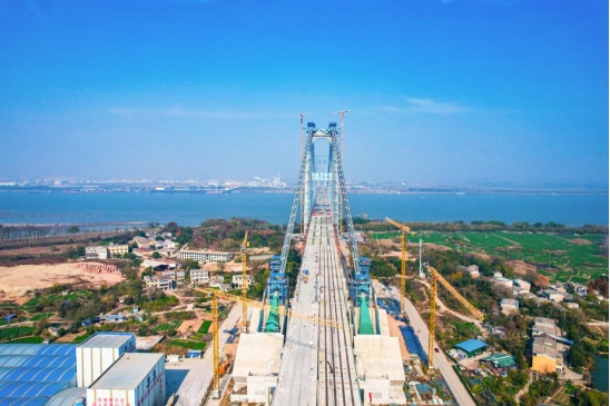 燕矶长江大桥横跨鄂州黄冈两地,采用一跨过江的方式,是世界最大跨径四主缆悬索桥。项目全长约26千米,大桥主跨1860米,上层为六车道高速公路,设计时速100公里,下层为四车道城市快速路,设计时速80公里,是一座集高等级公路与城市快速路于一体的多功能、复合型过江通道。由中交二航局承建的第三标段,线路全长约9公里,包括鄂州侧主塔、锚碇、桥面、单双层引桥,以及下游侧主缆等施工内容。其中,主跨共设有69个梁段,已于今年11月22日顺利合龙。