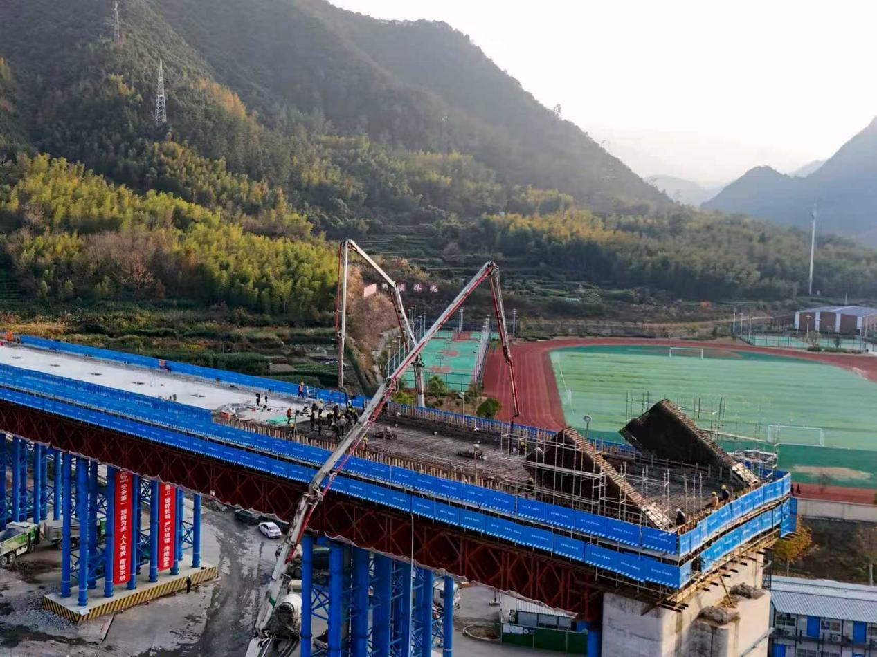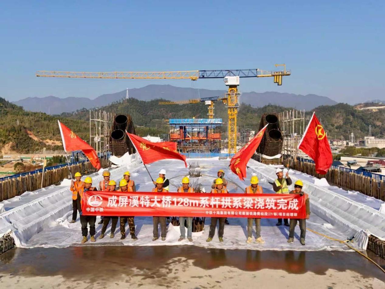 日前,中铁十局承建的衢丽铁路衢松段Ⅳ标项目全线重点控制性工程——成屏溪特大桥128米系杆拱系梁浇筑完成,标志着项目建设取得关键性突破,为后续钢管拱安装、吊杆张拉等工序奠定了基础。