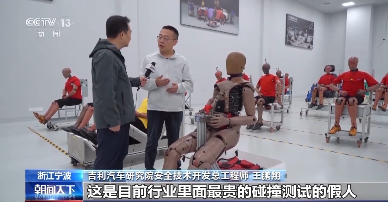 吉利汽车研究院安全技术开发总工程师 王鹏翔:这是目前行业里面最贵的一个碰撞测试假人,每一个肋骨都可以测量空间的位移量,最后形成一个最终的肋骨变形量,整个假人技术含量是非常高的。