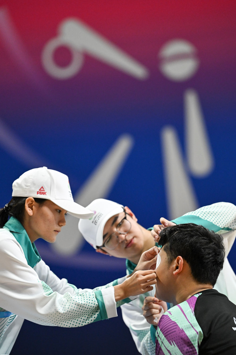 12月12日,志愿者在盲人门球男子1-8名交叉赛开始前为安徽队球员张洋调整眼罩。新华社记者 胡智轩 摄