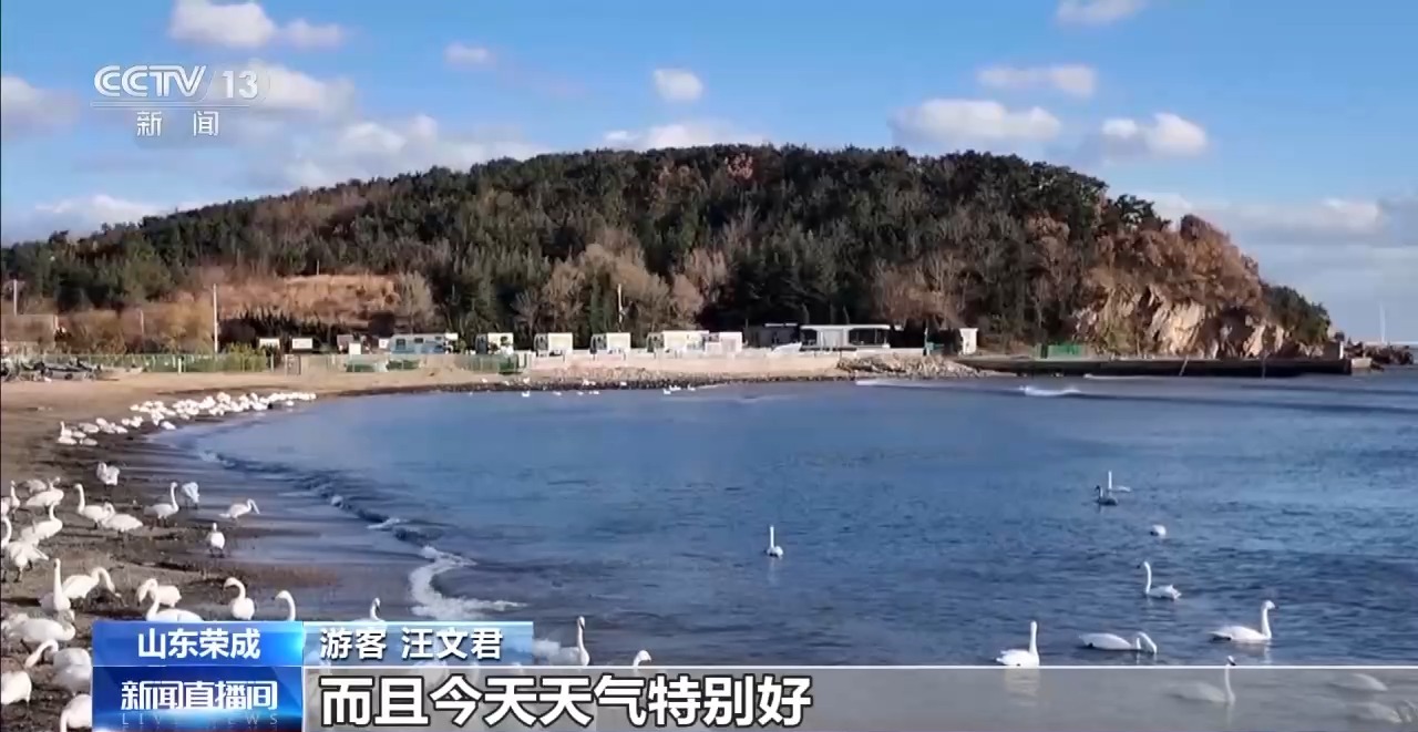 游客 汪文君:我们第一次看到这么多天鹅,而且今天天气特别好,我们就觉得非常震撼。