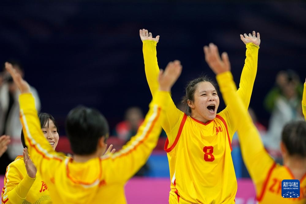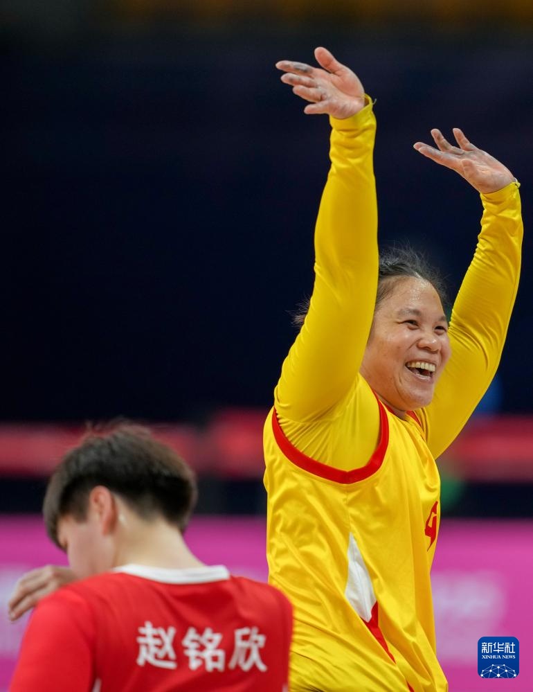 12月14日,广东一团队球员吕桂娣(右)与队友一起庆祝夺冠。新华社记者 吴鲁 摄