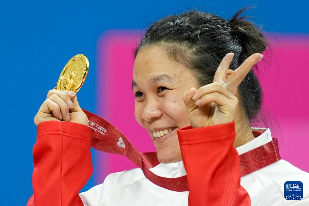 12月14日,广东一团队球员吕桂娣在颁奖仪式上展示金牌。新华社记者 吴鲁 摄