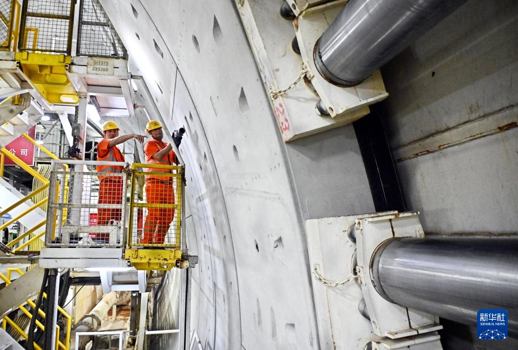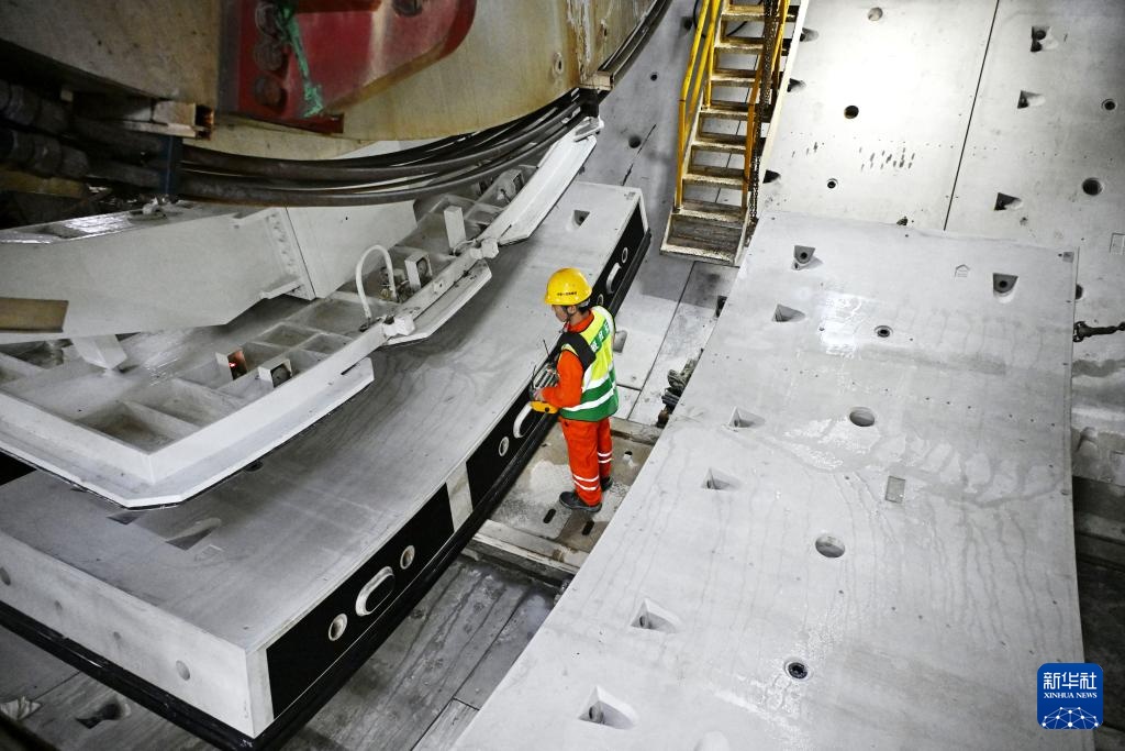 12月15日,中铁十四局建设者在海平面下91米进行管片拼装作业。新华社记者 李紫恒 摄