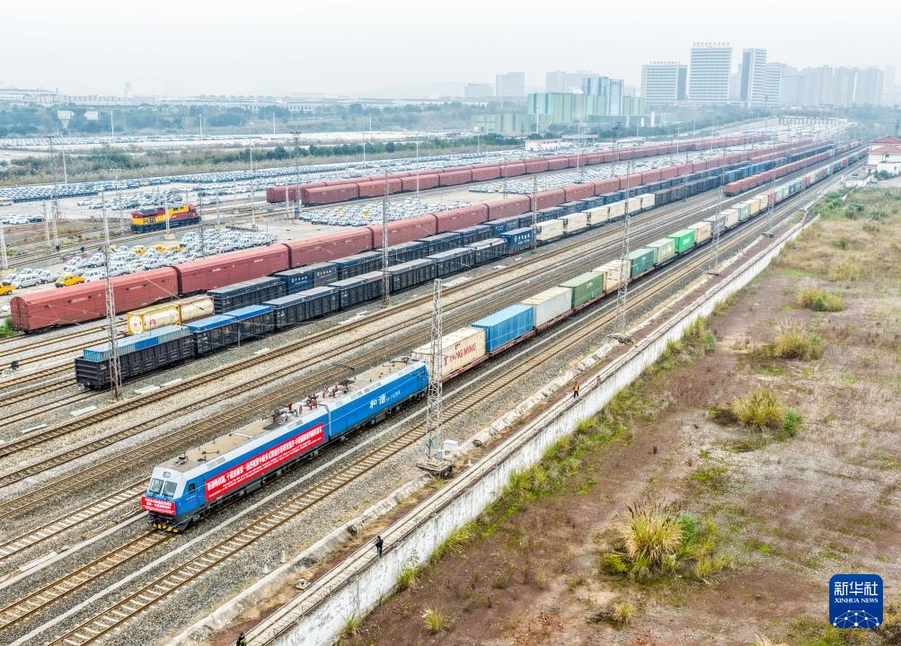 12月15日,中新多式联运示范项目重庆—东南亚班列在重庆鱼嘴站顺利发车(无人机照片)。新华社记者 唐奕 摄