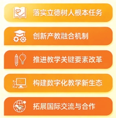 第二期“双高建设计划”有五大改革任务。一是落实立德树人根本任务,着力打造有职教特色的思政课程,开发与真实生产场景深度融合的课程思政示范课程,将工匠精神融入校园环境与文化活动。二是创新产教融合机制,搭建产教融合新载体,创新协同化育人模式,健全制度化保障体系。三是推进教学关键要素改革,推动“双高建设计划”与高技能人才集群培养计划捆绑实施,协同推进专业、课程、教材、师资、实习实训五大要素综合改革。四是构建数字化教学新生态,夯实数字基座,升级数字资源,创新智能教学模式,推动平台贯通应用,系统提升数字素养。五是拓展国际交流与合作,强化科学布局,健全标准规范,创新合作形态。
