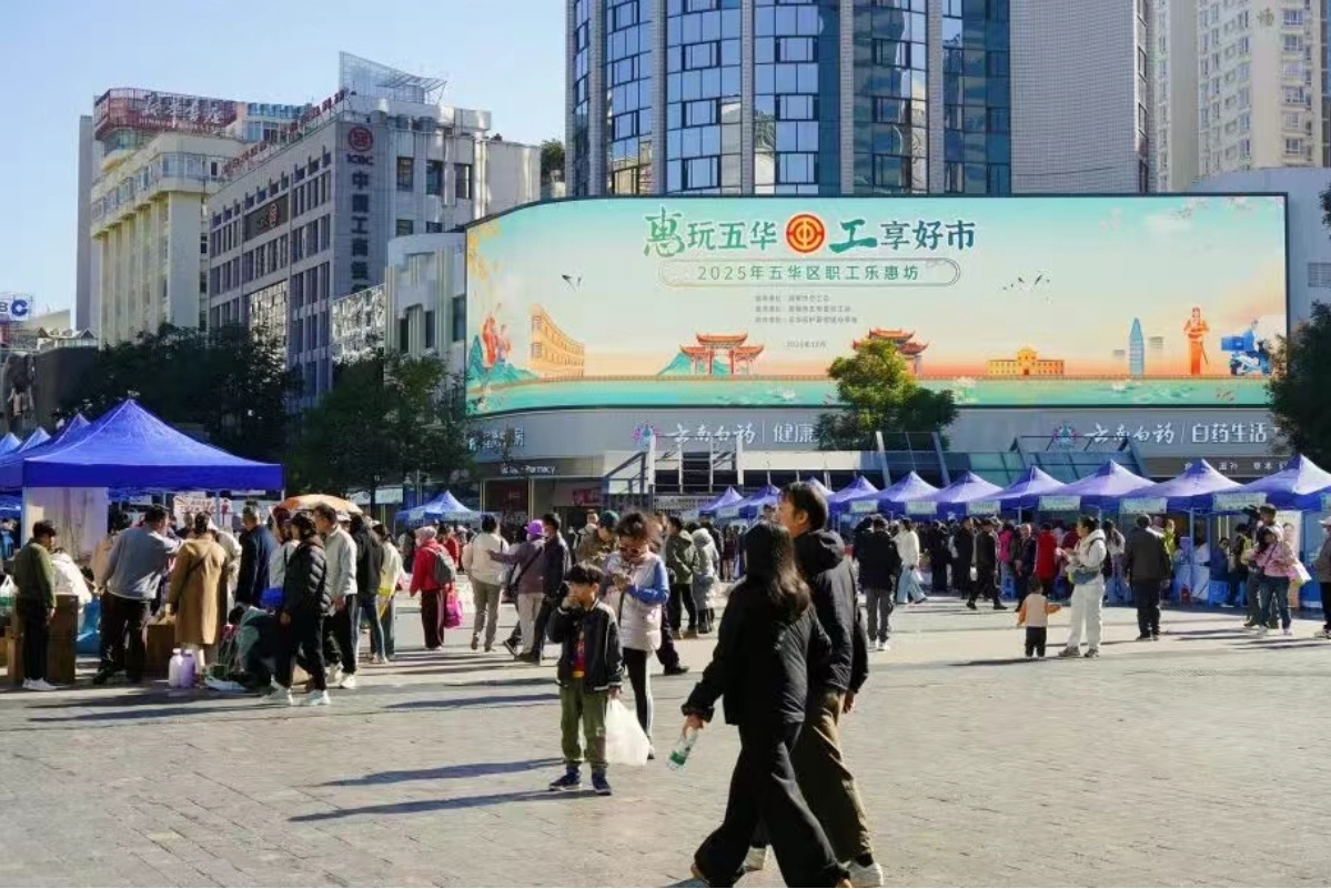 和张益霞一样,很多职工都收获满满,这些温暖的场景,正是职工普惠活动的生动缩影。近日,昆明市五华区南屏街中心广场人气汇聚、暖意融融,五华区总工会举办“‘惠’玩五华·‘工’享好市”2025“职工乐惠坊”普惠活动,通过线上线下联动,吸引职工广泛参与,汇聚起“暖工助企促发展”的暖流。