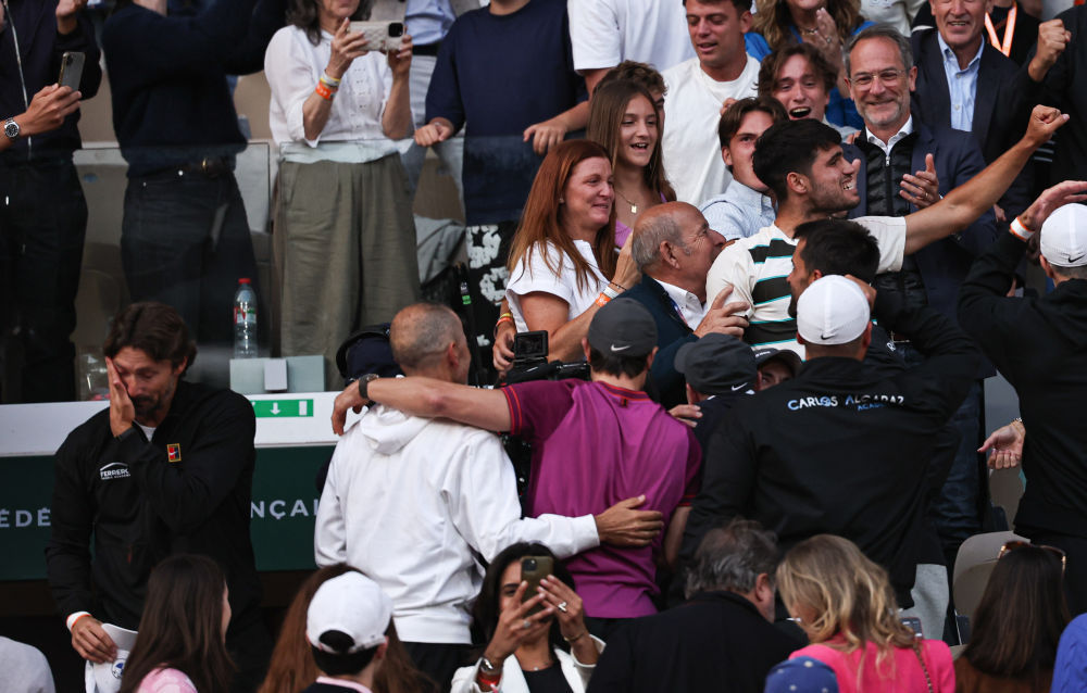 2025年6月8日,阿尔卡拉斯在赛后庆祝,他的教练费雷罗(左一)在一旁擦拭眼泪。当日,在2025法国网球公开赛男单决赛中,西班牙选手阿尔卡拉斯3:2战胜意大利选手辛纳,夺得冠军。新华社记者 李京 摄